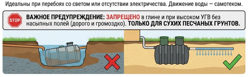 Для дачи нужен септик без электричества или гибридная система, которая не умрет, если вы уедете на всю зиму. Главная проблема сезонного проживания — неравномерность стоков: 5 дней пусто, 2 дня густо. Классические аэрационные станции в таком режиме «голодают» и перестают чистить воду.