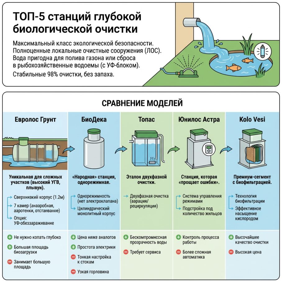 Ранее мы уже разбирали эту модель, но в рейтинге глубокой очистки она занимает почетное место «эталона». Именно Топас задал стандарт двухфазной очистки (фаза аэрации / фаза рециркуляции). Если вам нужна бескомпромиссная прозрачность воды и вы готовы платить за сервис — это лидер.