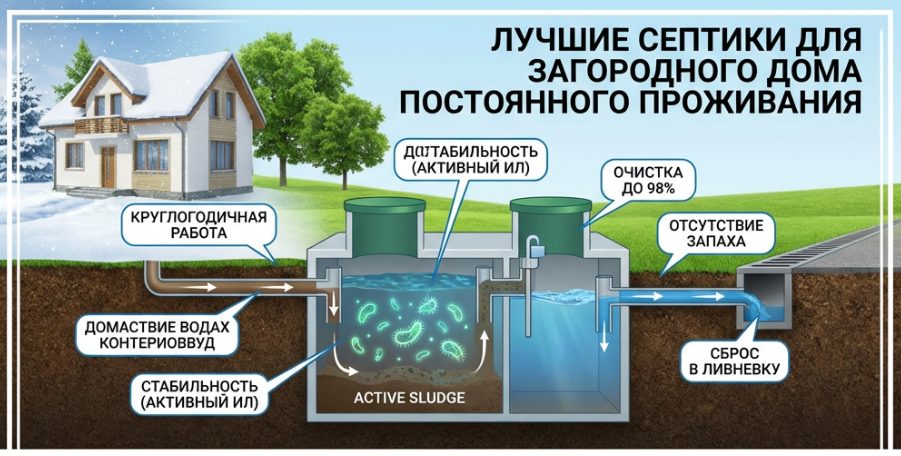 Если в доме живут круглый год, системе канализации приходится работать в режиме нон-стоп. Здесь важна стабильность: бактерии в аэробных станциях привыкают к регулярному поступлению «пищи» (стоков) и вырабатывают активный ил. Главные требования к таким системам — максимальная степень очистки (до 98%), отсутствие запаха и возможность сброса воды прямо в ливневку.