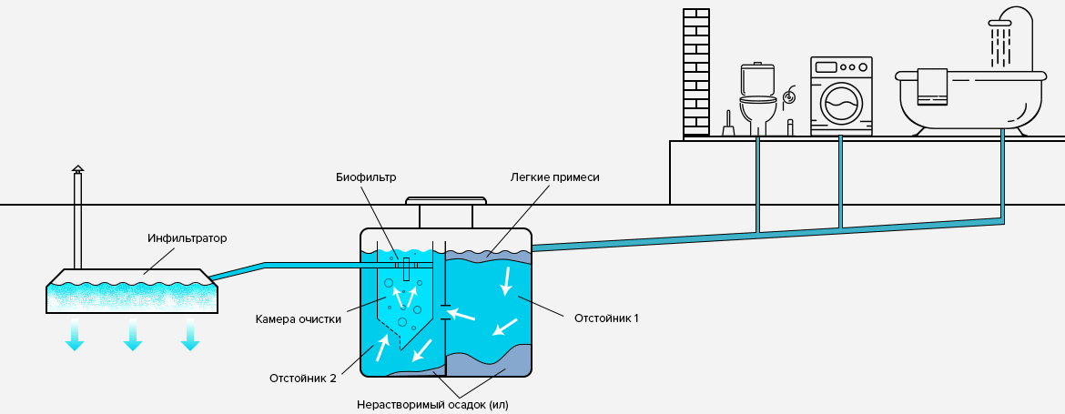 При выборе оборудования учитывайте тип грунта на вашем участке. Если, например, почва глинистая, простое решение накопительного типа не подойдёт. Лучше установить полноценную ЛОС, которая собирает и перерабатывает канализационные стоки.